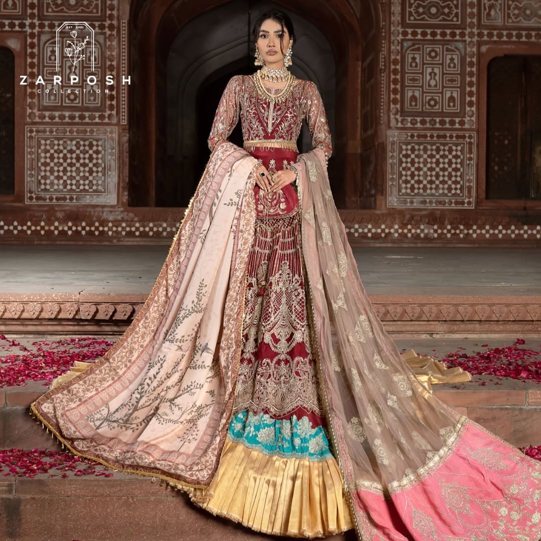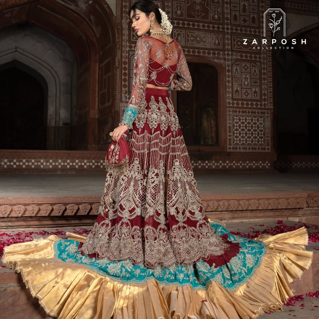 Embroidery: Intricate Gold Tilla work featuring unique architectural and tree motifs on the daman.